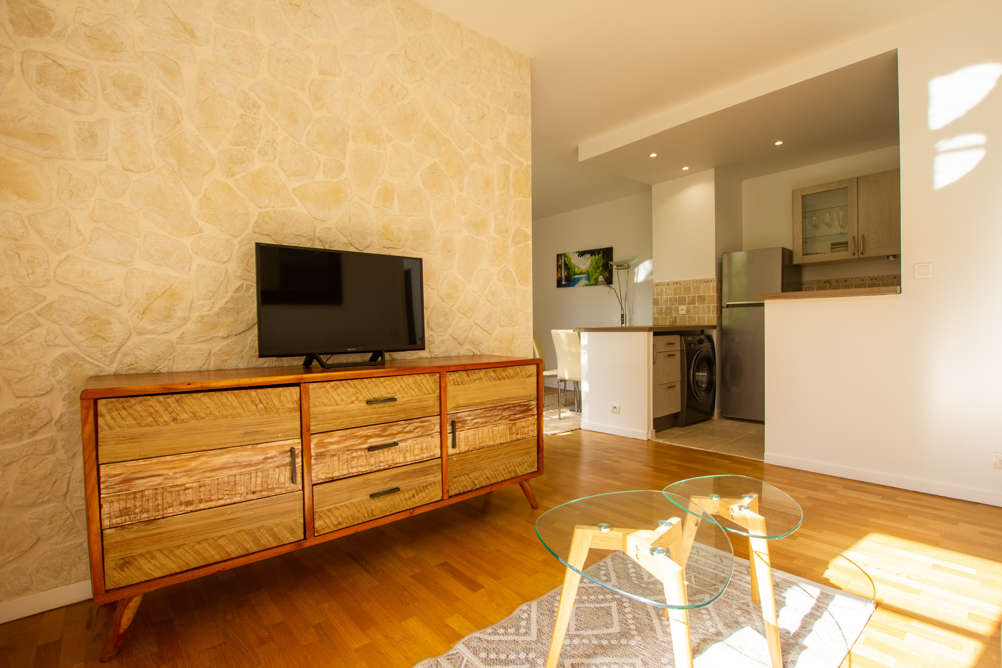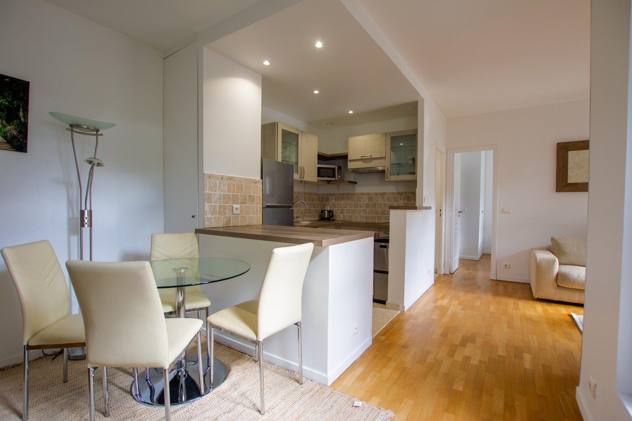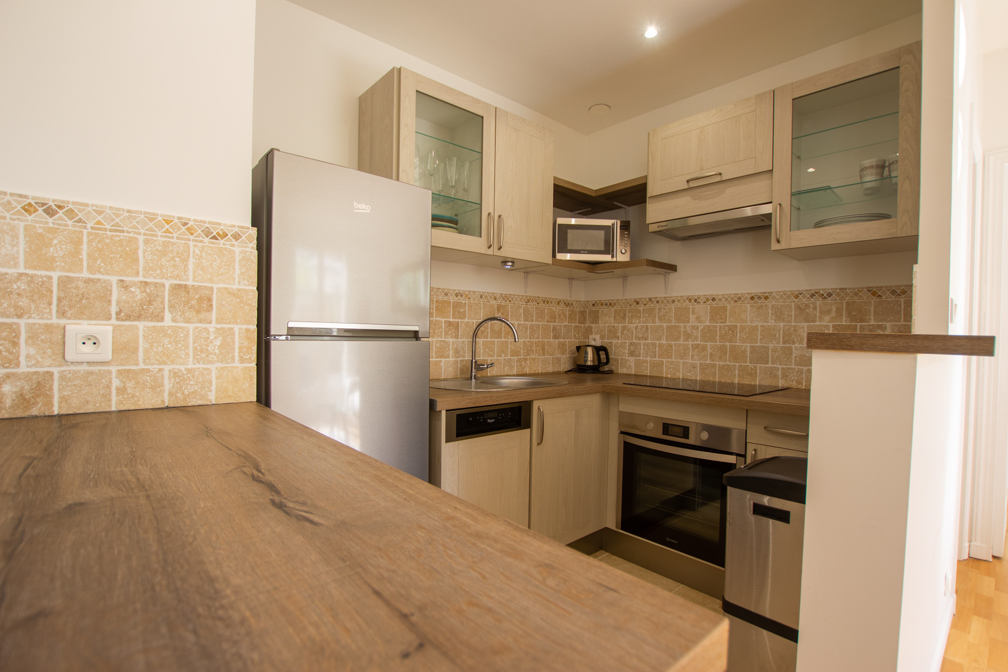 Il se compose d’une entrée, d’un séjour avec une cuisine ouverte (lave vaisselle, hotte, machine à laver le linge, plaque de cuisson induction, four , four à micro onde), d’une chambre avec salle de bains attenante et un WC séparé.