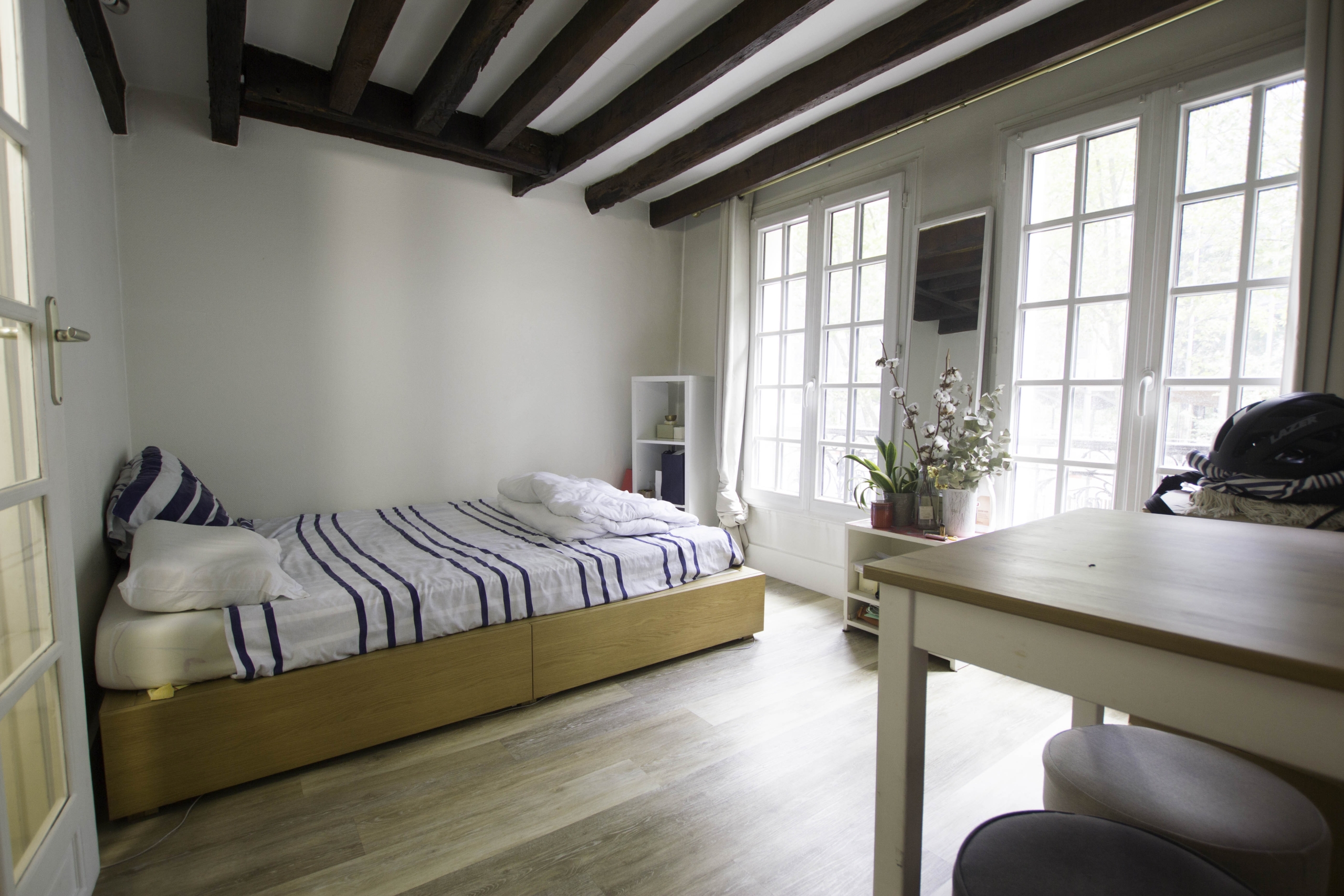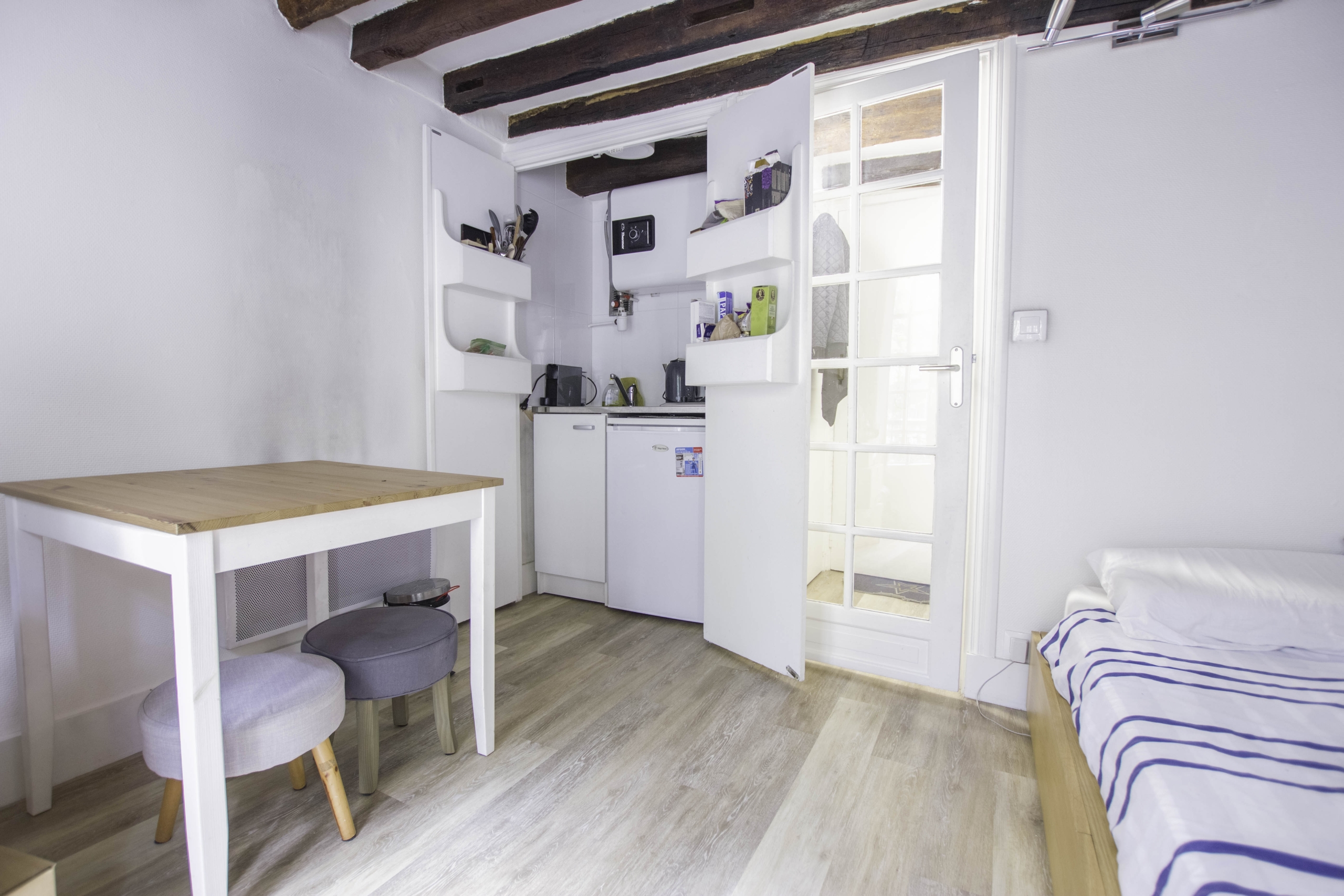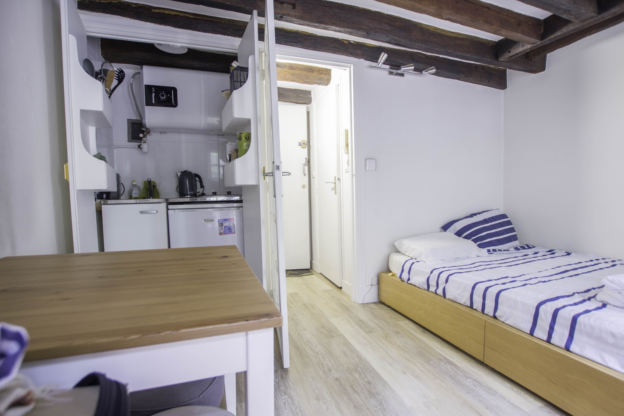 Ce studio confortable est un bijou parisien offrant une vie citadine exceptionnelle. L’espace est intelligemment aménagé pour maximiser chaque centimètre carré, avec une attention particulière aux détails et au design. Les poutres apparentes au plafond ajoutent du caractère à l’intérieur, rappelant l’histoire de l’immeuble.