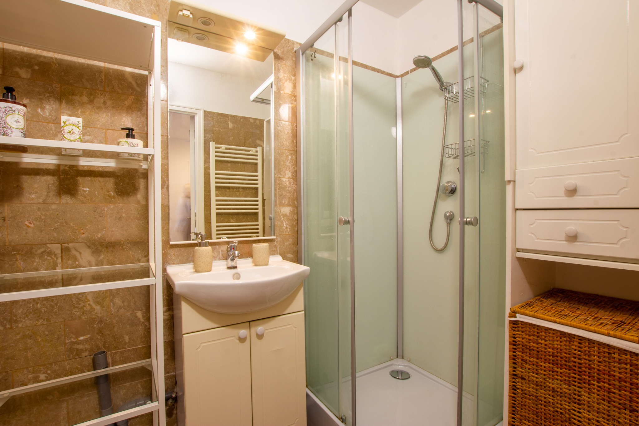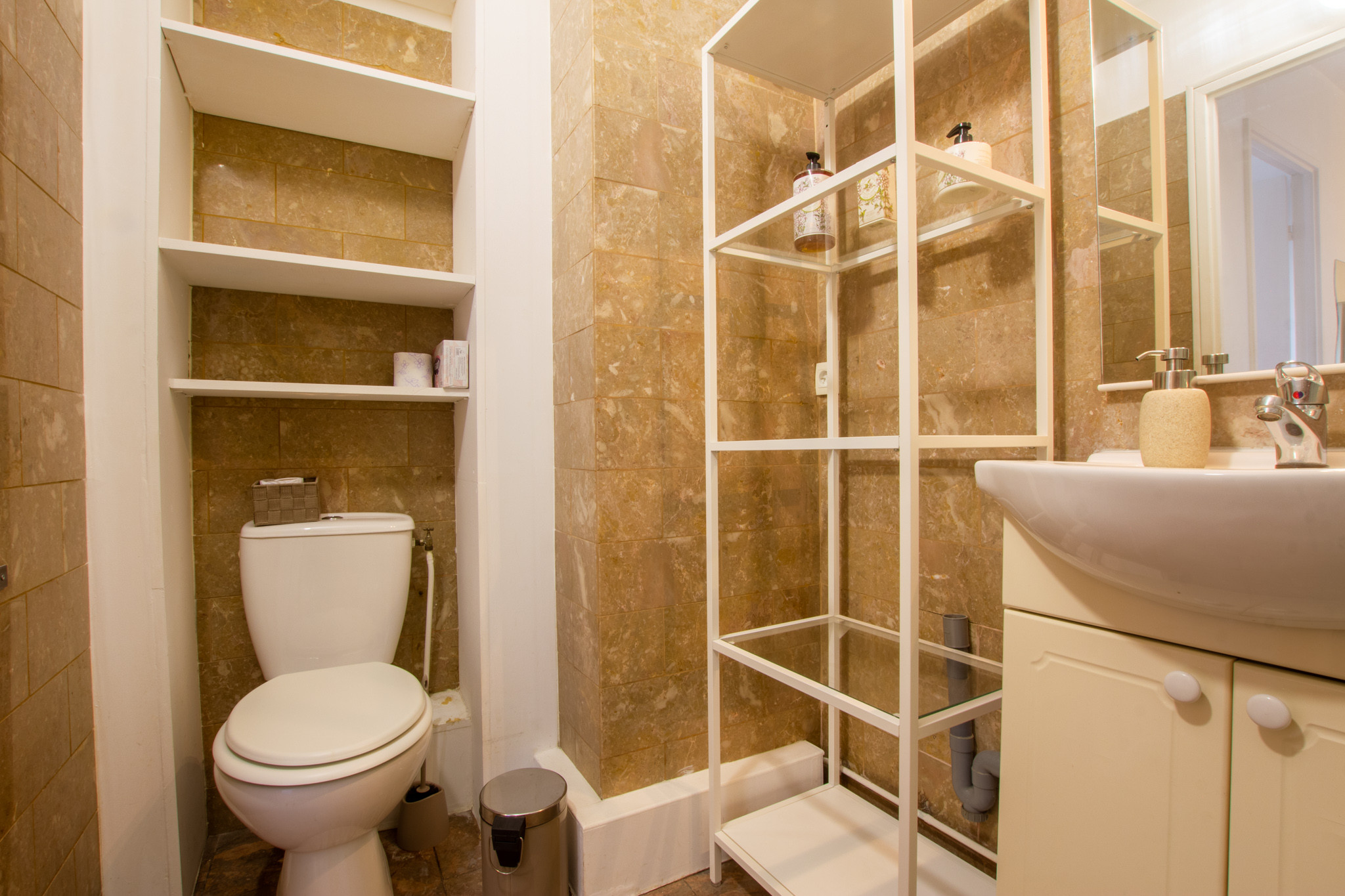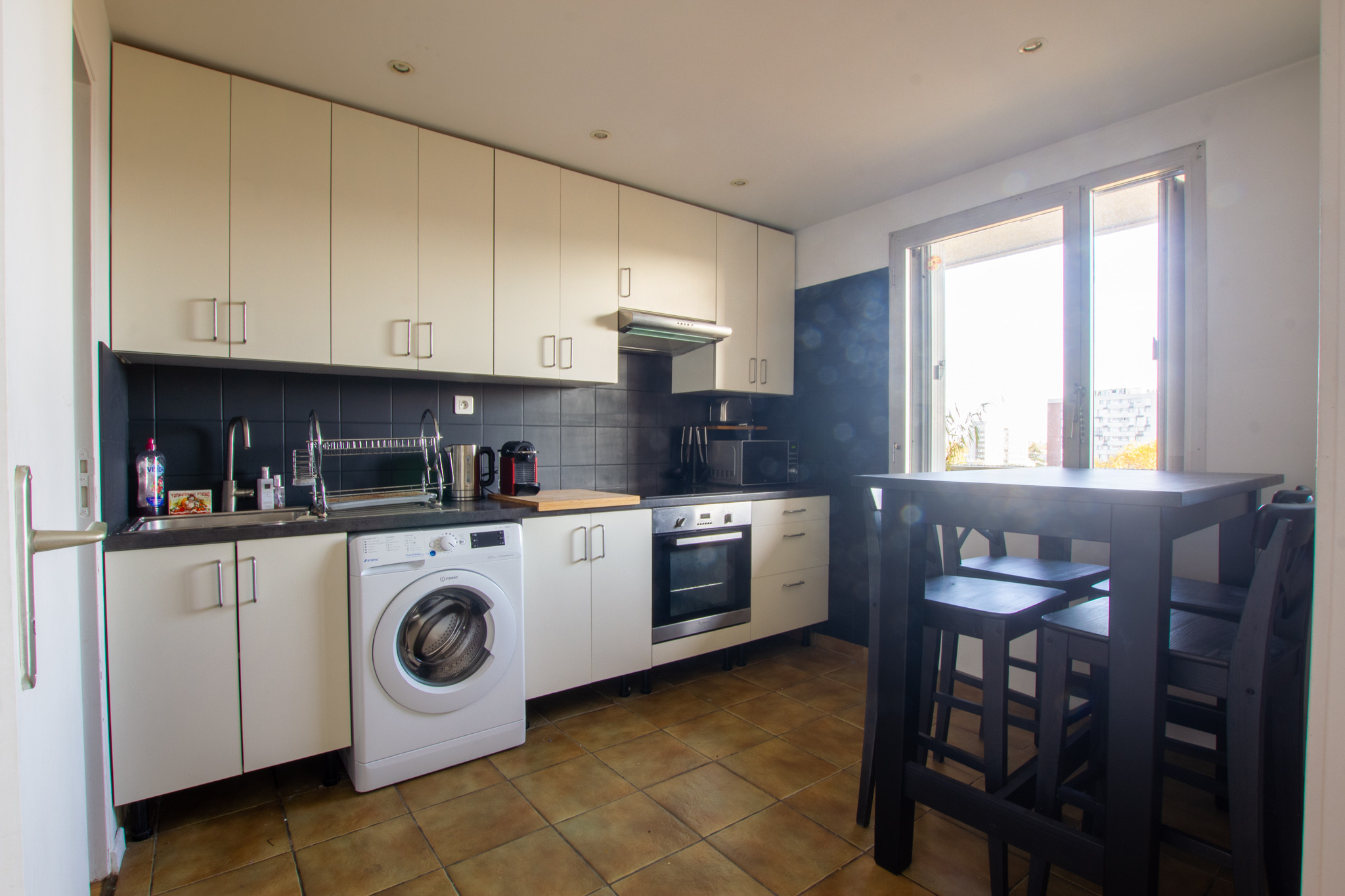 Il se compose d’une entrée avec un grand dressing de 6 m2, d’un séjour avec accès sur le balcon, une cuisine entièrement équipée ( machine laver, plaque de cuisson, hotte, four, micro onde, réfrigérateur et congélateur), d’une grande arrière cuisine, d’une chambre et une salle d’eau avec WC.