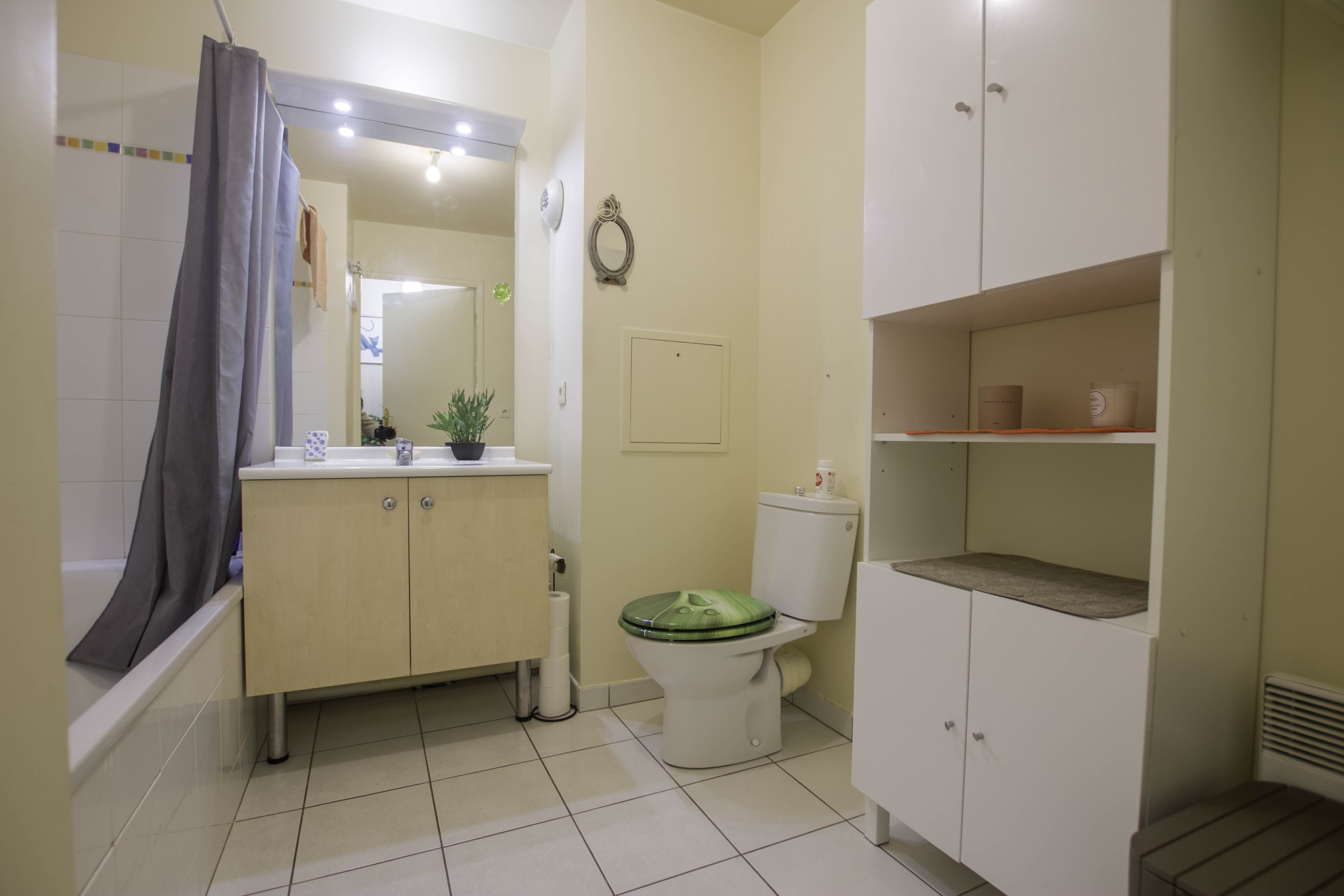 La chambre, avec ses rangements intégrés, offre un espace de repos calme et confortable, tandis que la salle de bains, équipée d’une baignoire et de WC, vous garantit des moments de détente absolue.